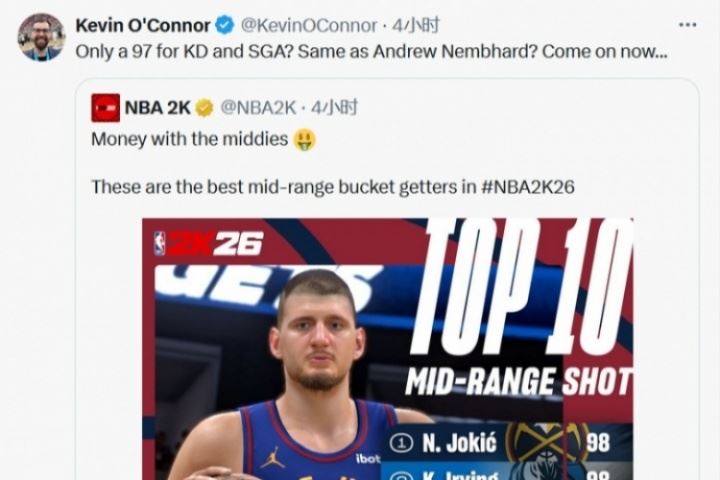 体育资讯08月12日讯 《NBA 2K26》的球员中投属性前十已经出炉。约基奇和欧文以98并列第一,紧随其后的是97的杜兰特、布克、亚历山大、内姆哈德和库里、之后是96的德罗赞、麦克布莱德和米德尔顿。