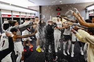 赛后斯普利特在更衣室被泼水庆祝,还拿到了比赛用球。