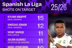 西甲射正次数排行:姆巴佩15次居首 维尼修斯第二、小蜘蛛第四
